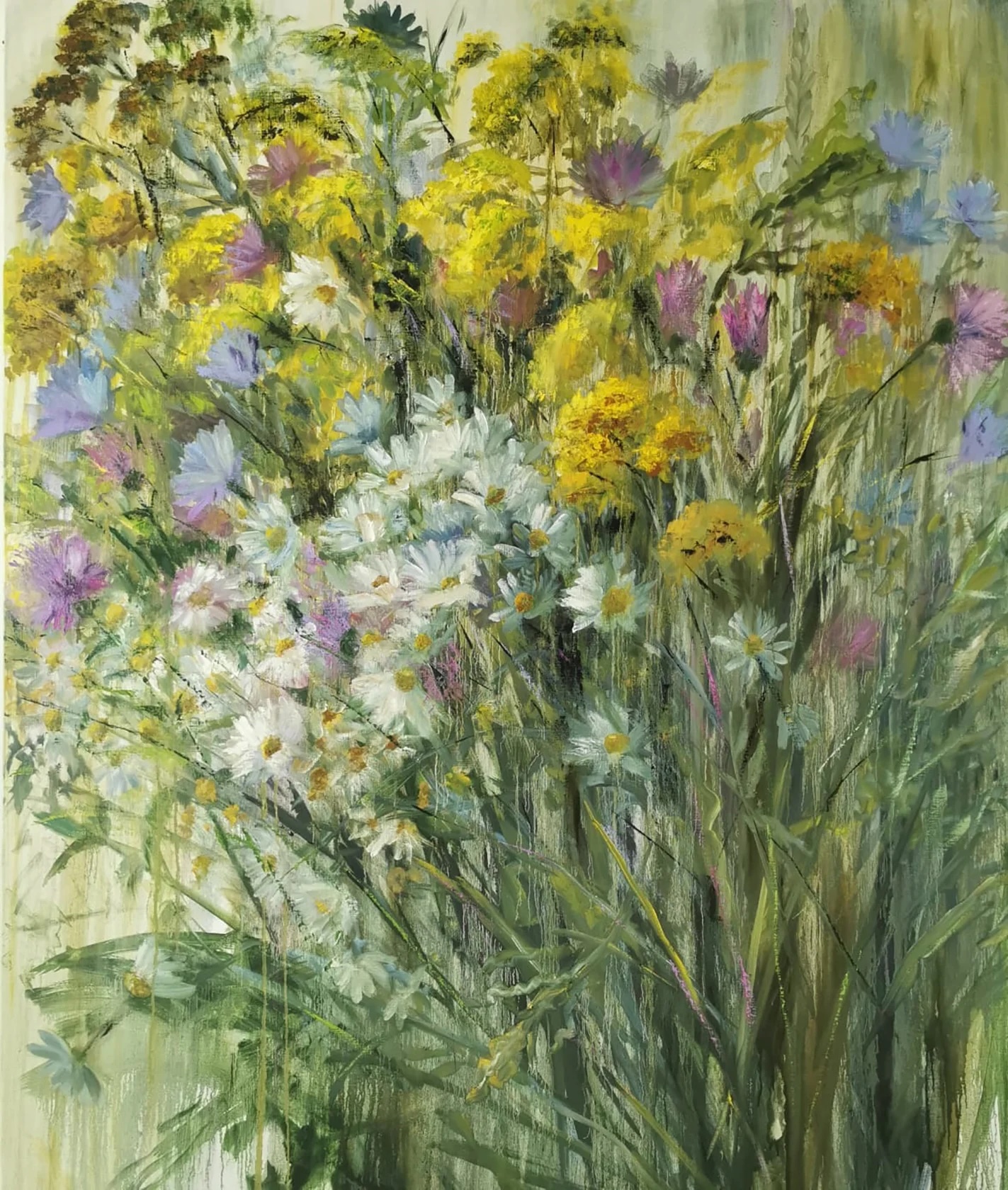 Before us is a real bouquet of life, embodied in the natural splendor of wild flowers. "The scent of wildflowers" is an ode to nature, its endless energy, diversity and sincere beauty. Each flower on the canvas is painted with love and attention to detail: delicate daisy inflorescences contrast with fluffy balls of yellow and purple meadow flowers, creating a lively and vibrant rhythm.