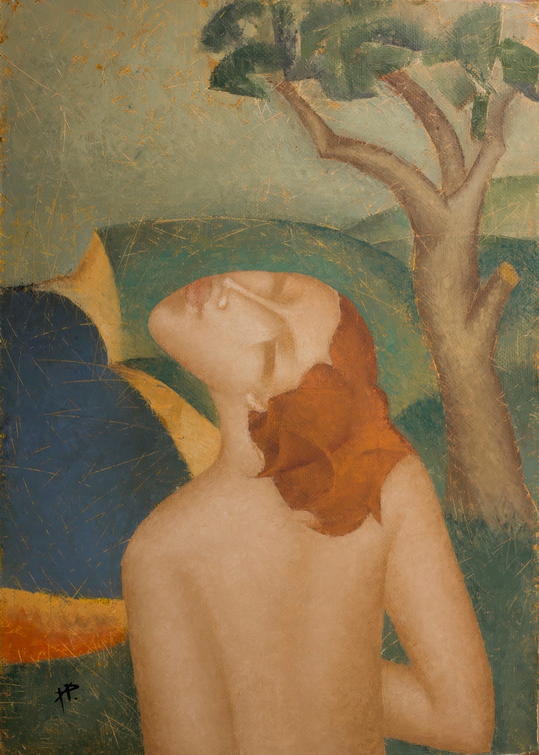 The composition of the painting is simple and laconic, but at the same time very expressive. The vertical arrangement of the woman’s figure creates a feeling of striving upwards. The lines of the trees and the sky, echoing each other, give the painting depth and perspective.