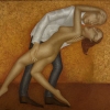 At the center of attention is a dancing couple, captured at the climax of their dance. The man, supporting the woman, seems to float in the air. Her body, executed in a stylized manner, radiates grace, strength, and sensuality. It seems that they have forgotten everything else, engrossed only with each other.