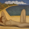 The composition of the painting is simple and laconic, but at the same time very expressive. The horizontal arrangement of the woman’s figure creates a feeling of stability and balance. The curves of the body and the lines of the sand, echoing each other, give the painting dynamism and liveliness.