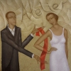 The color scheme of the painting is maintained in harmonious combinations of gray, white, and red, which creates a feeling of elegance and style. The contrast between the man’s dark suit and the woman’s light dress emphasizes their difference and, at the same time, their unity.