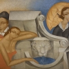 At the center of attention is a composition formed by several figures and an architectural element resembling a fountain or spring. Each figure, executed in a stylized manner, represents a certain aspect of human nature or a certain stage in history.