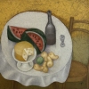 The watermelon, with its juicy red pulp, symbolizes summer warmth and the sweetness of life. The cheese and fruit, arranged on a plate, add a touch of sophistication and refinement to the painting. The bottle of wine and the glass seem to invite the viewer to share a quiet evening with the characters of the painting and enjoy simple pleasures.