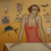 In the background, on the wall, various objects are hung: fish, airplanes, playing cards, geometric figures, and mechanisms. These objects, at first glance, seem to be a random set, but upon closer inspection, they become symbols of various spheres of life: travel, entertainment, science, art. Each of them can be a key to understanding the inner world of the heroine.