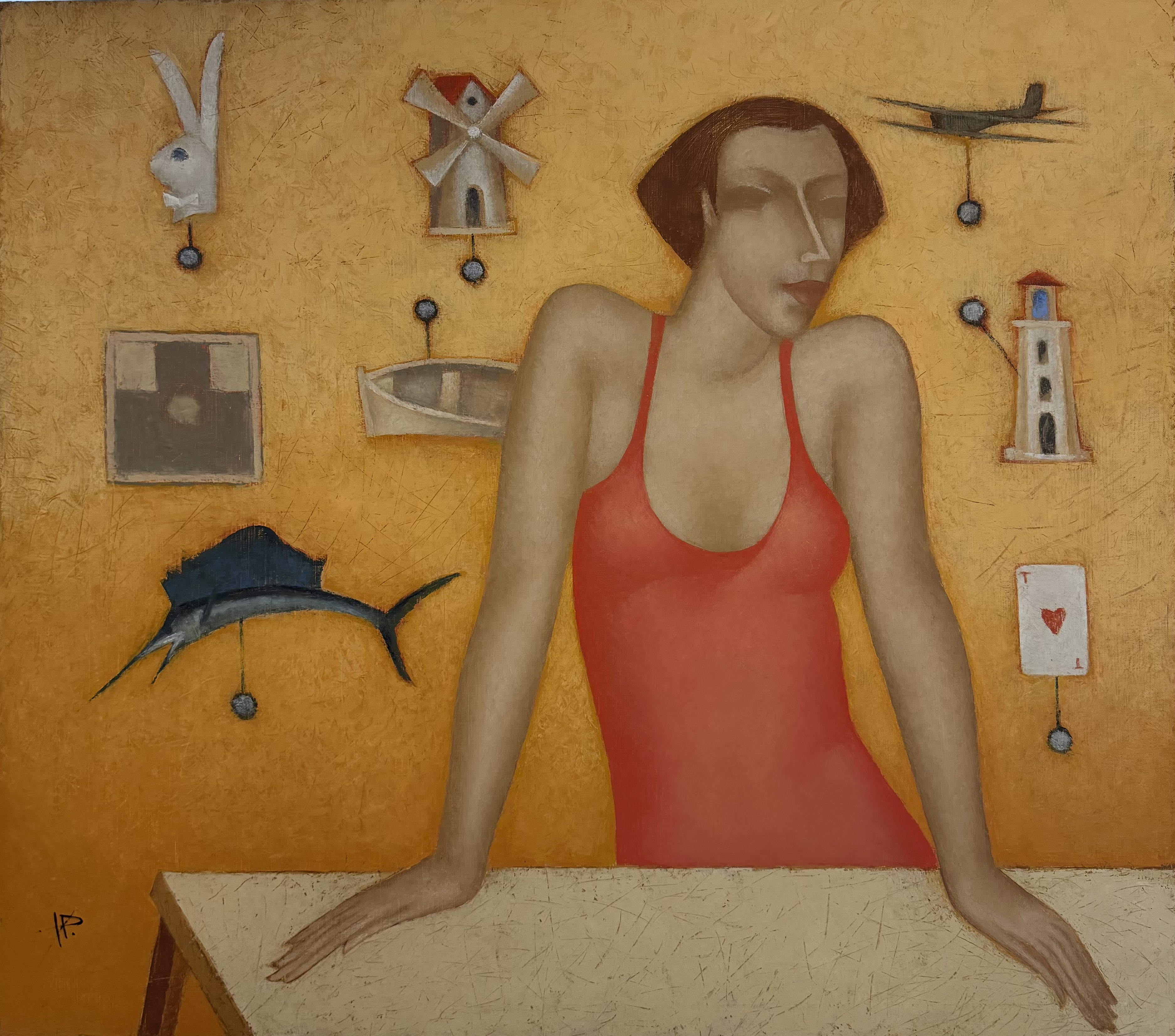 Nikolai Reznichenko’s painting “Shooting Range” is not just an interior with a woman and objects laid out before her; it is a complex and multifaceted composition, full of symbolism and allusions. The artist creates a mysterious atmosphere, inviting the viewer into a world of dreams, memories, and fantasies, where reality intertwines with fiction, and each object carries a hidden meaning. This canvas is not about a specific place, but about the human consciousness, about its ability to create and interpret the world around it, filling it with its own meanings and experiences.