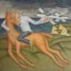 The background of the painting is executed in muted, pastel tones. Green hills, clouds, and the sky create a feeling of vastness and infinity. Combined with the figures of the rider and the deer, this creates an atmosphere of mystery and magic.
