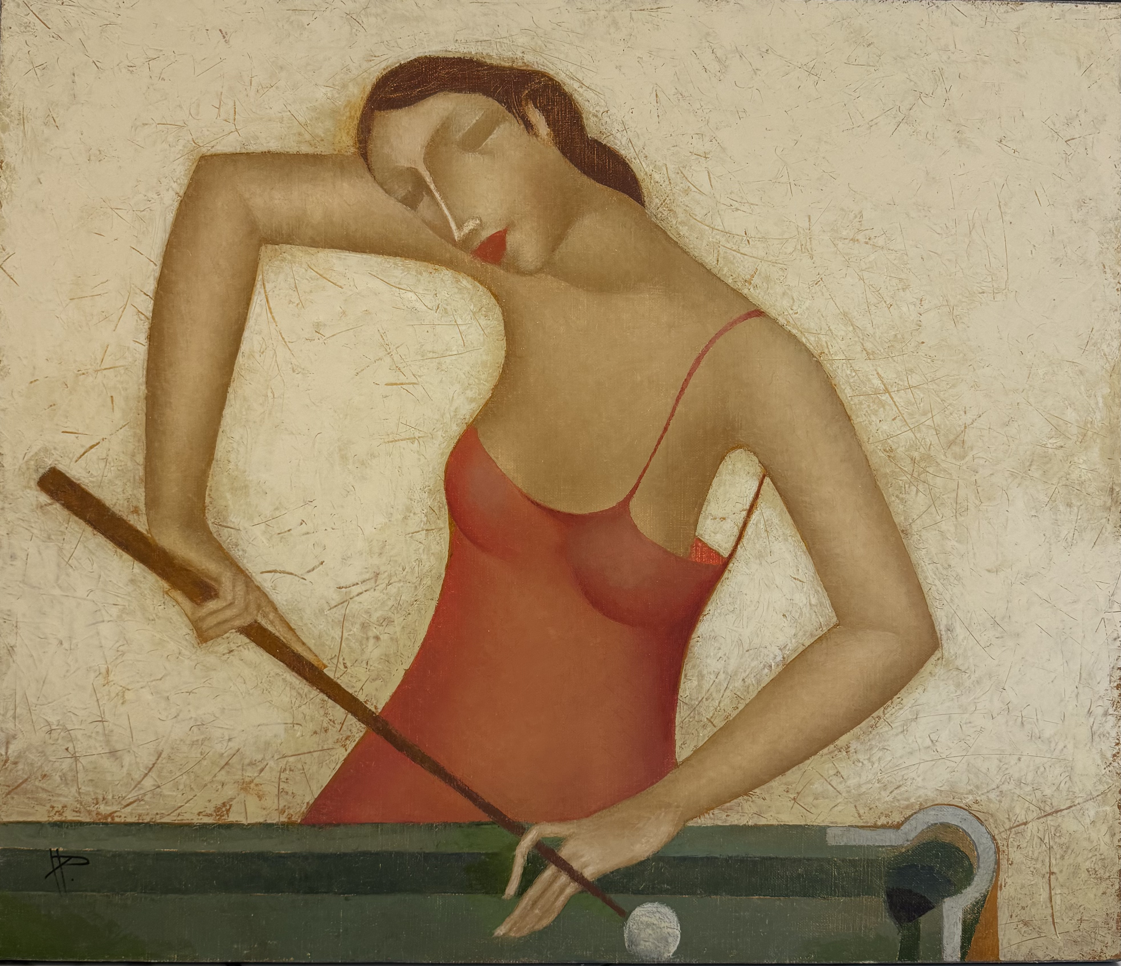 At the center of attention is a woman standing at a billiard table, with a cue in her hand. Her figure, executed in a stylized manner, radiates confidence and tranquility. The elongated lines of the body, smooth curves, and the elegant tilt of the head create a feeling of harmony and grace. There is no hint of bustle or tension in her pose; she is completely focused on the game, as if forgetting everything else.
