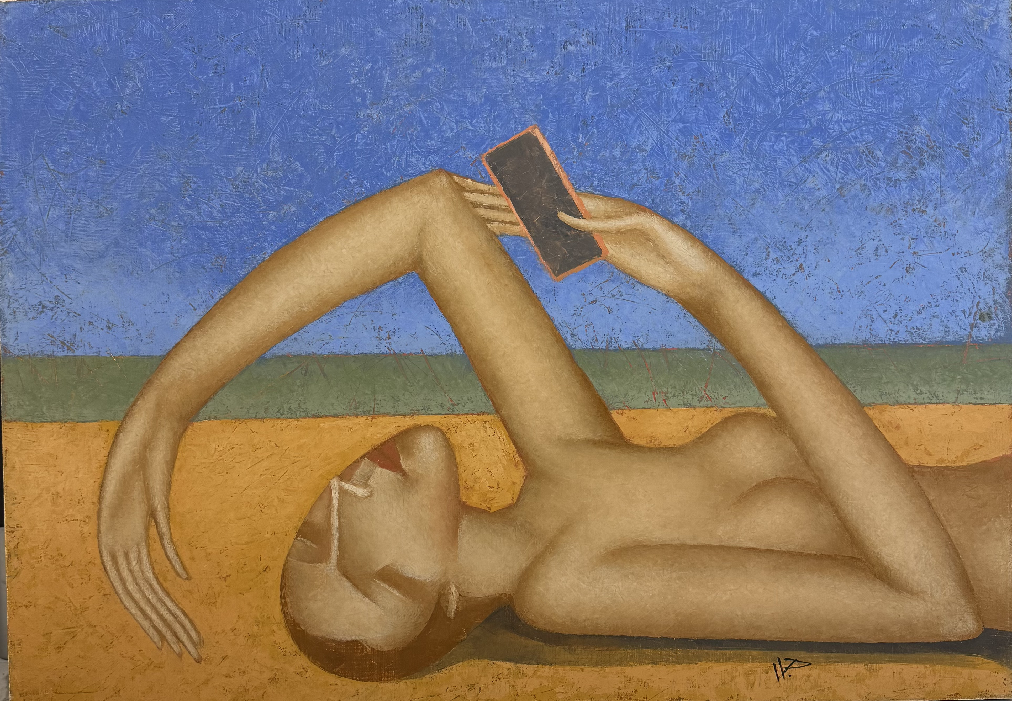 The landscape is executed in muted, pastel colors. The sand, sea and sky merge into a single whole, creating a feeling of infinite space and freedom. But this freedom turns out to be illusory, because the woman’s gaze is riveted to a small screen that limits her perception of the world.