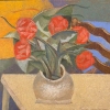 The central element of the composition is a bouquet of scarlet flowers, placed in a simple ceramic jug. The flowers, stylized and somewhat simplified, nevertheless radiate energy and vitality. Their bright color contrasts with the muted color palette of the rest of the painting, attracting the eye and focusing attention on the transience of beauty. Perhaps these are roses or peonies - flowers often associated with love, passion, and fleetingness.