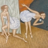 At the center of attention are two ballerinas caught in the moments of preparing for a performance. One, sitting on the floor, ties the ribbons of her pointe shoes, intently bowing her head, the other, standing in a graceful pose, holds a flower in her hand. Their movements are frozen in a certain harmony, as if a moment before the start of the dance. However, this seeming serenity is deceptive. In the tense poses, in the restrained emotions, one feels an inner struggle, a premonition of responsibility, excitement before the upcoming performance.