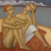 There are two stylized human figures, seemingly sitting together on a beach. One has what appears to be a bathing suit bottom and is leaning forward with arms wrapped around their legs, looking out towards the water. The other is leaning back with their head resting on one hand, also facing the water.