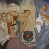 The scene shows many people and it appears the central one is the record, this piece shows the power the music has.