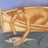 The painting features a nude female figure leaned over a boat with a large fish in the water. The setting of the water creates the need to feel something special.