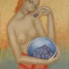 The painting centers around a nude female figure, holding a bowl brimming with ripe plums. Her gaze is downward, her posture almost languid, lending the scene a sense of quiet intimacy. The figure is rendered in a stylized manner, her features simplified and elongated, a trademark of Reznichenko’s artistic style. This stylization allows the viewer to focus on the overall composition, rather than getting caught up in realistic details.