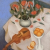 Reznichenko’s use of color is carefully considered and contributes significantly to the painting’s overall impact. The cool blues and grays create a sense of serenity and balance, while the warmer tones of the flowers and the fruit add a touch of energy and vitality. The way all the colors come together makes the piece amazing to view.