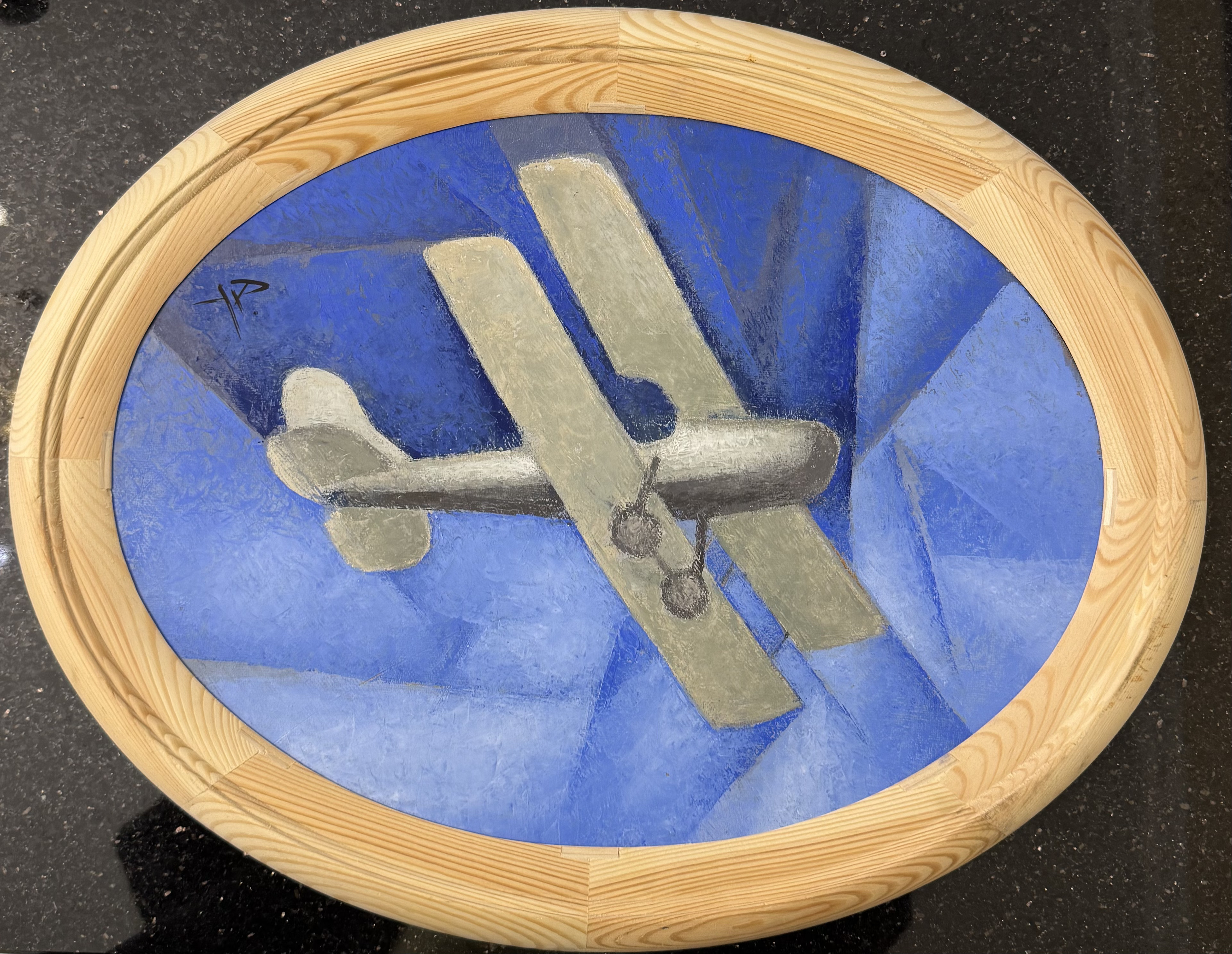 The painting’s circular frame adds a unique dimension to the composition. It further enhances the impression of flight and movement, as if the airplane is contained within a circular space.