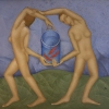 The painting features two nude figures, each with one arm extended to support a shared burden: a bucket filled with goldfish. The figures are rendered in a somewhat stylized manner, with simplified features and elongated limbs, echoing a classical or mythical aesthetic. The absence of clothing shifts the focus entirely to the human form and the interaction between the figures.