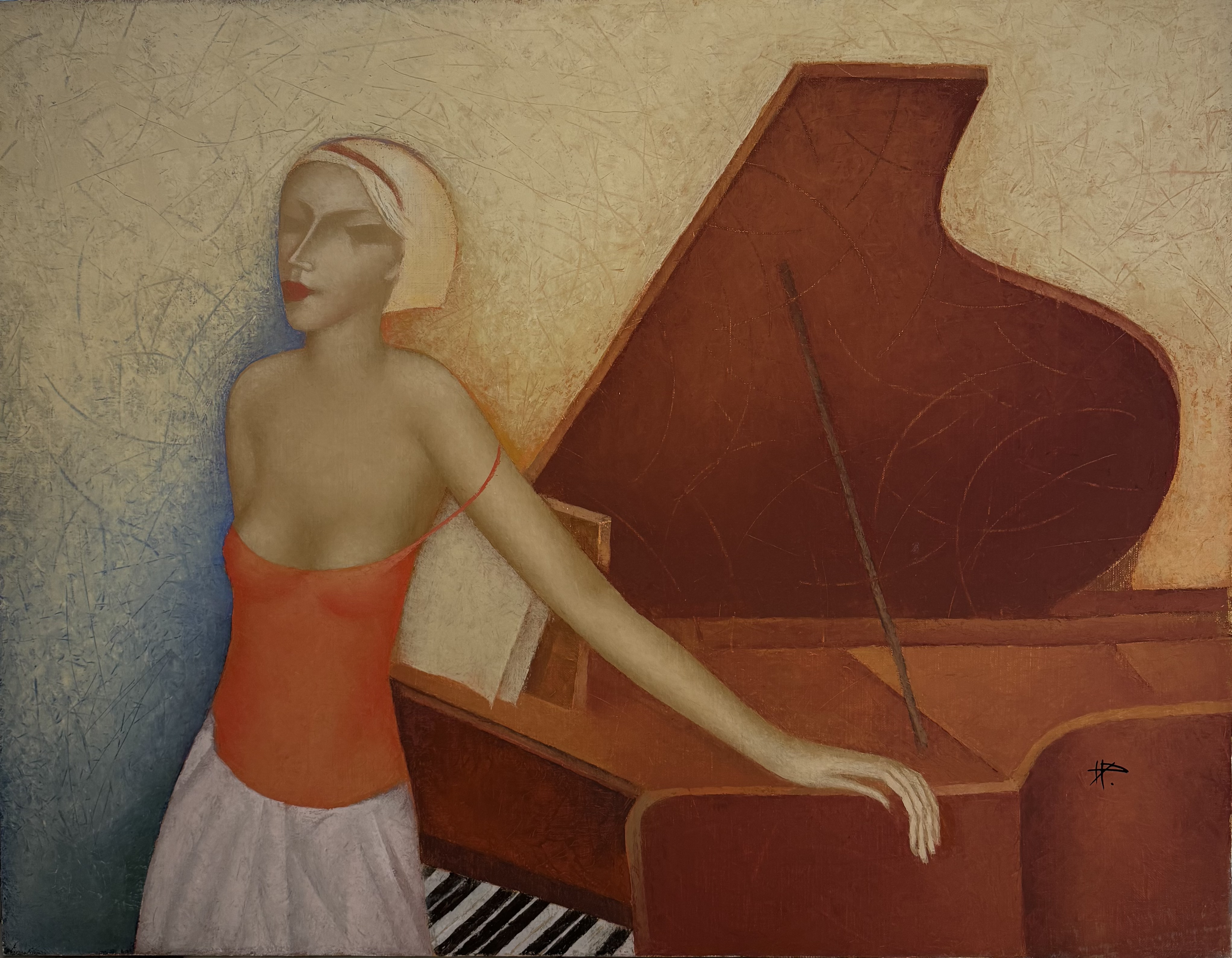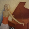 The painting features a female figure standing beside a grand piano. The figure is rendered in a stylized manner, with elongated limbs, simplified facial features, and a focus on geometric shapes. While not strictly realistic, the artist captures a sense of poise, elegance, and perhaps a hint of melancholy in the woman’s expression.