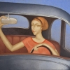 The painting features a woman behind the wheel of a vintage-style car. The figure is rendered in a somewhat stylized manner, with elongated limbs and simplified facial features. While not strictly realistic, the artist captures a sense of self-assuredness and determination in the woman’s gaze.