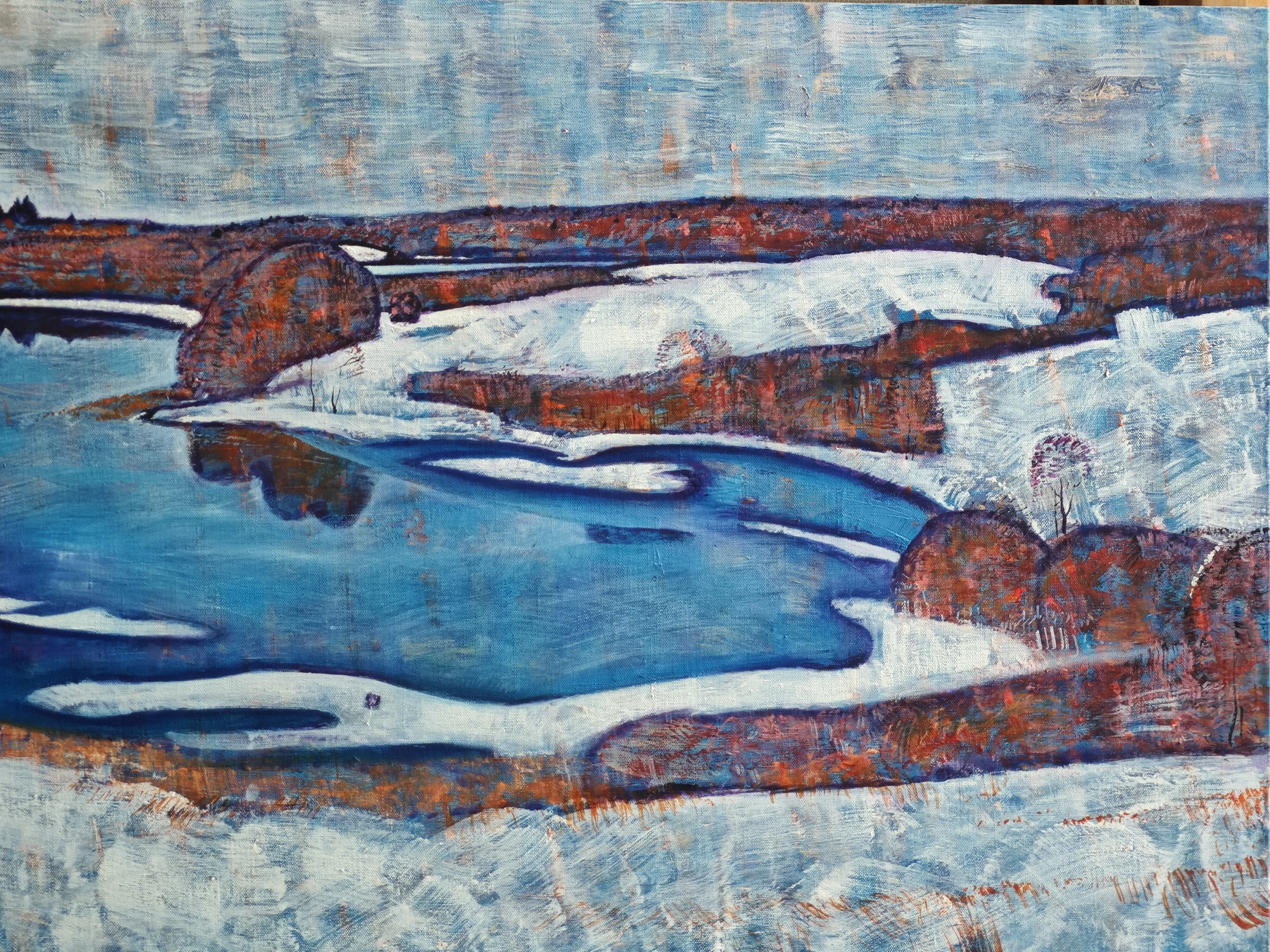 Spring in this work is the awakening nature of frozen bodies of water. Bluish ice reflecting the colored sky coexists with the first signs of melting. The artist conveys the subtle balance between winter coolness and the coming warmth. A soft palette, calm lines create a sense of anticipation of a new life.