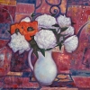 "Bouquet" is a celebration of life, captured in color and texture. Volumetric white peonies in a simple jug combine tenderness and luxury. Red poppies framed by rich backgrounds create a bright accent, enlivening the composition. The structure of the brushstroke conveys the movement of the petals, and the background complements the floral motif with complex geometry, giving the work a modern sound.