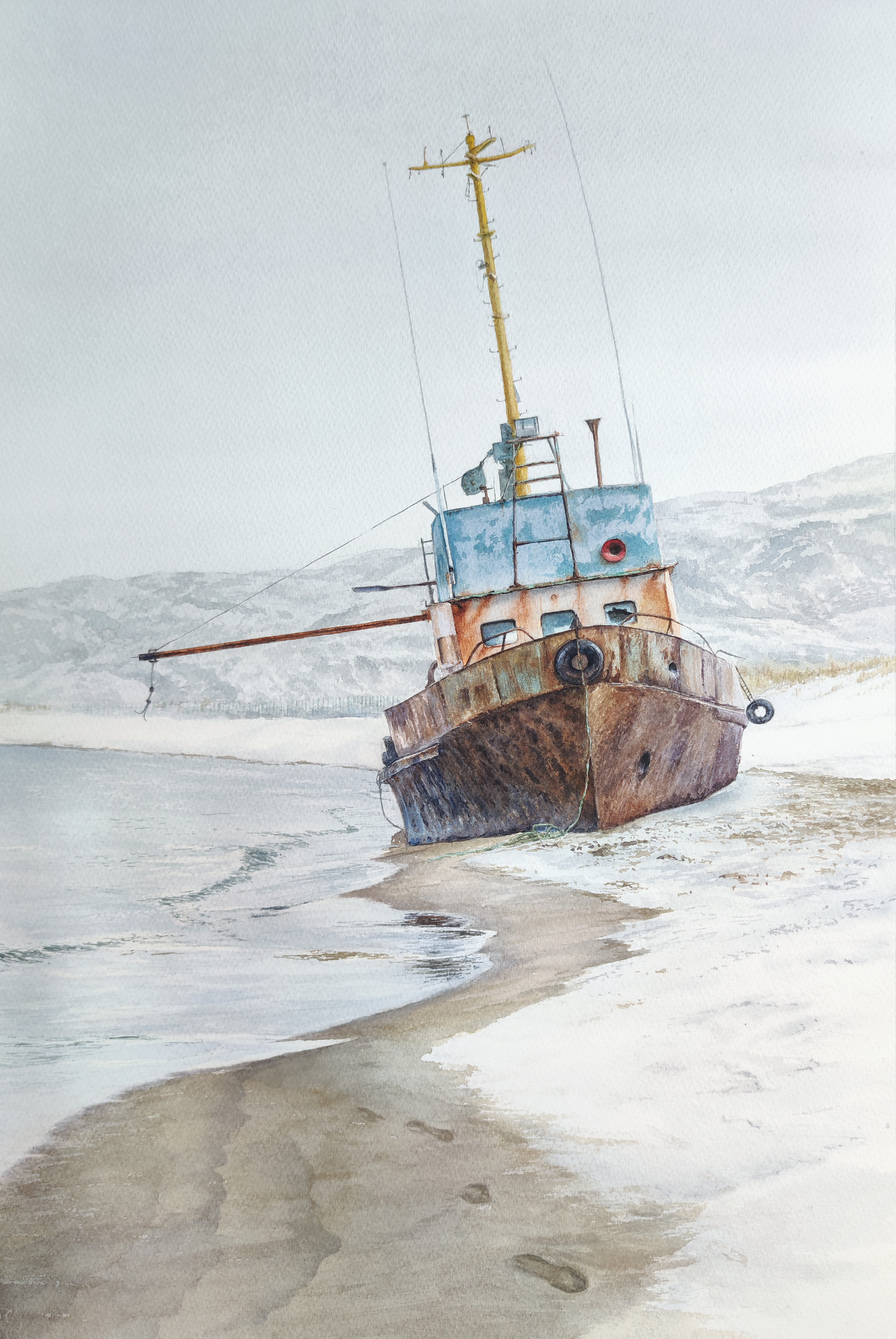 After a winter storm on the harsh shore of Teriberka, a vessel suddenly appeared. Without a crew or any identifying marks, this mysterious ship seemed to have emerged from nowhere, like a ghost from the past. The boat, with the look of an experienced and wise traveler, seems to have found its final refuge. It sat aground with dignity, as if deciding it was time to rest from endless journeys and conquered waves. It feels as though neither nature nor man could move it from this new, chosen place, where it now rests as an eternal beacon of memory from days gone by.