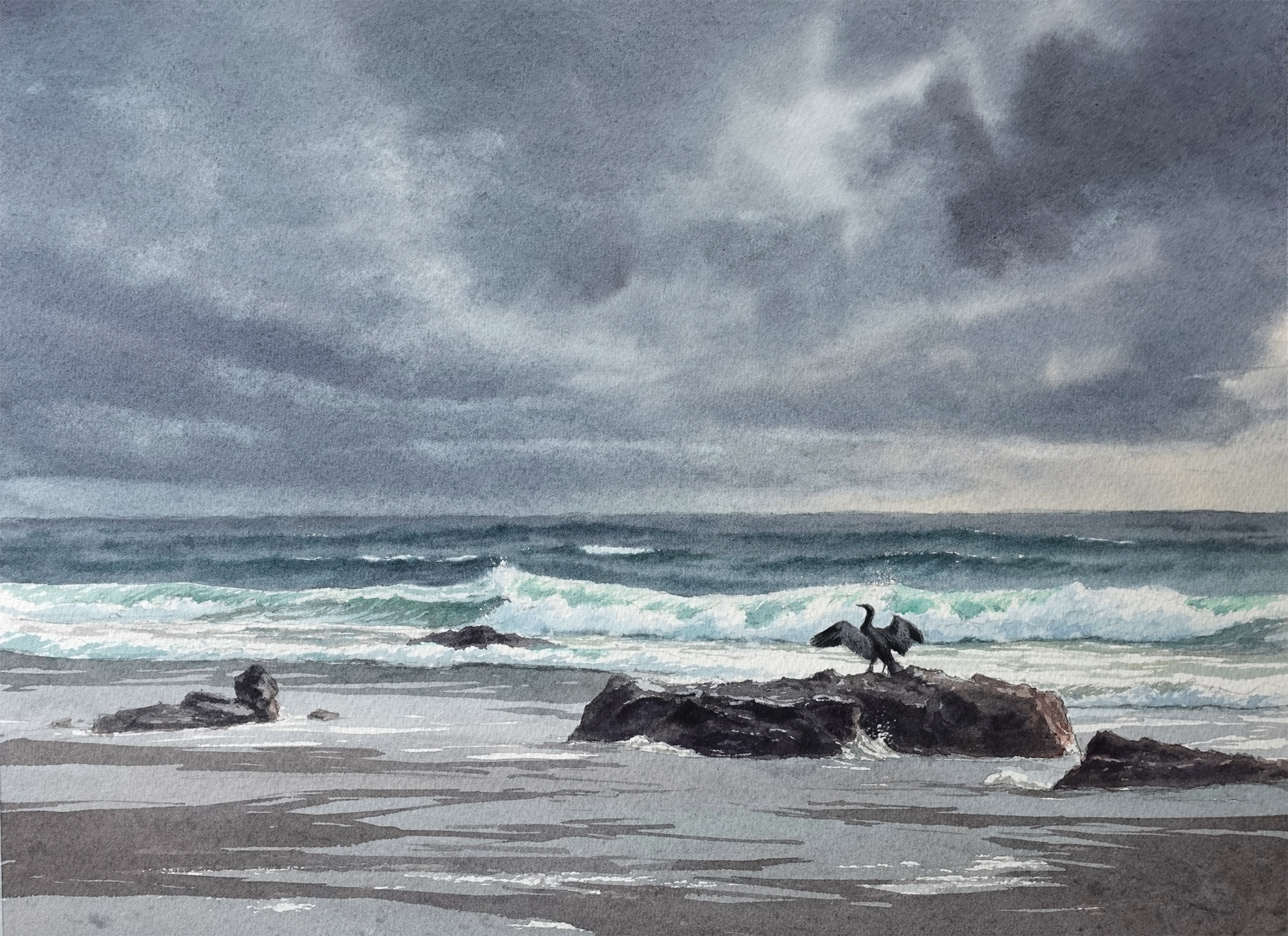 The painting "In the Light" is about the fragility and strength of nature. I wanted to convey the sense of contrast between the harsh sky, heavy clouds, and an unexpected burst of light illuminating the wave and the solitary cormorant on the rock. This light highlights moments of solitude and freedom, when even on the gloomiest day nature reveals its beauty. The theme of inner resilience is dear to me, and I tried to express it through this cormorant, calmly facing the elements.