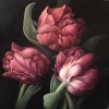 The composition "Tulips" amazes with the magnificence and sculptural power of floral beauty. On a large square canvas, the artist places three large tulips of dark pink, garnet and soft purple shades. All attention is focused on these flowers - without unnecessary entourage, only the depth of the black background and lush petals, as if illuminated by a soft beam.