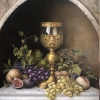 Around the cup are fruits: a scattering of white and dark grapes, figs with a rich purple cut, peaches and apricots. Each fruit is painted masterfully, with maximum attention to detail: you can see the velvety skin of the figs, the crisp juiciness of the grapes, the muted mother-of-pearl of the peaches. The foliage intertwined in the background gives the entire composition a living basis, linking the figures of the golden vessel and the fruits in a single dance of nature and culture.