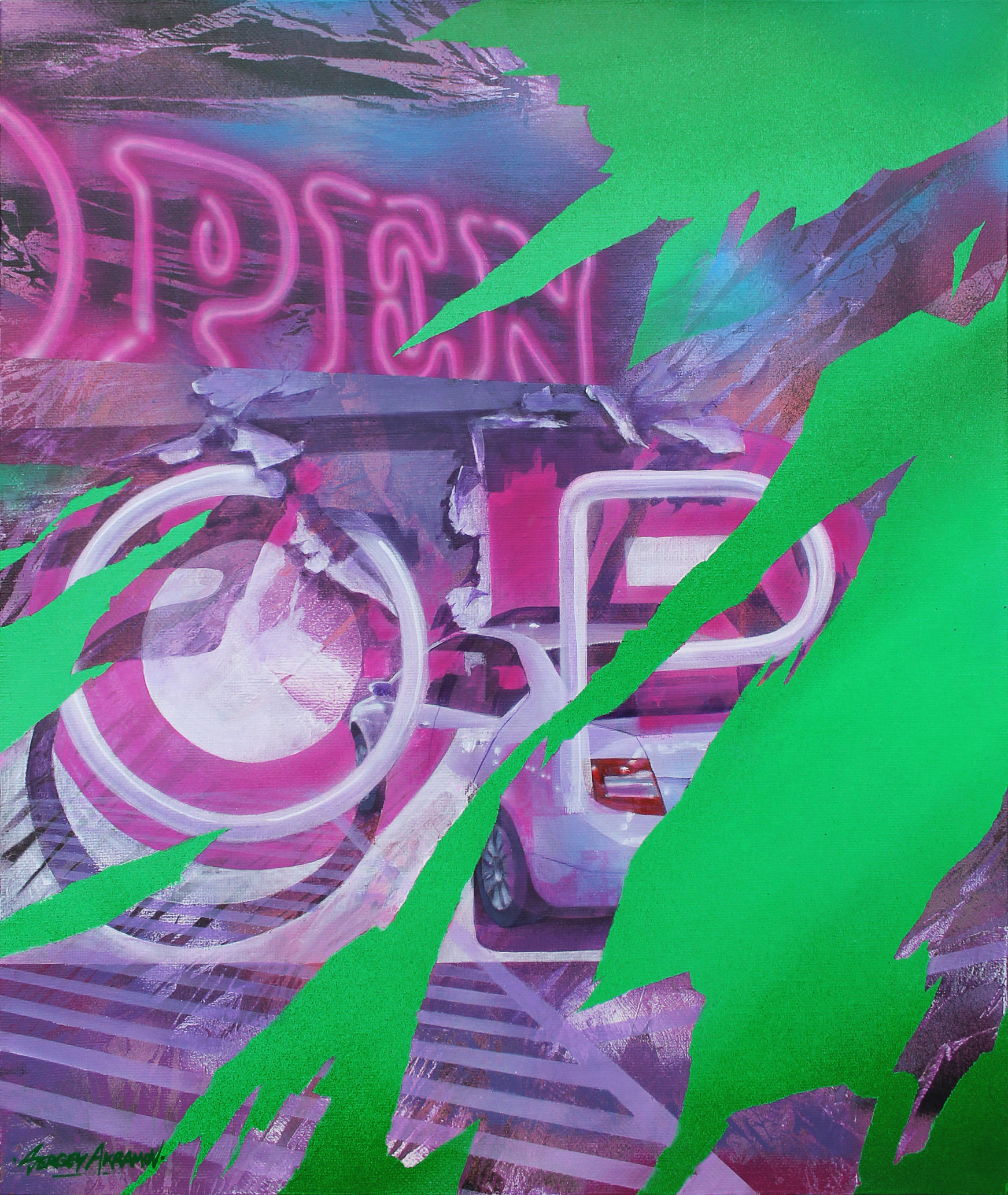 The painting "OPEN" immerses the viewer in the atmosphere of a night city, where bright neon lights become a kind of beacons of everyday life. The central element of the composition is a large neon sign with the inscription "OPEN", flickering against the background, in which a car, part of the street and abstract splashes of color can be guessed. Green dynamic brushstrokes, like window openings through a veil of rain, invade the space of the painting, breaking it into fragments and creating a sense of movement and surprise. Mixed media successfully combines realistic drawing of details - the characteristic shine of neon tubes, reflections on glass and wet asphalt - with elements of abstraction and graphic art, hinting at the pulse of a big city. All this helps to convey the mood of eternal expectation, constant readiness for change: the city never sleeps, it is always "open" to new stories and chance encounters. A bright color scheme based on combinations of pink, purple and neon shades fills the work with energy, and the effect of sharp brushstrokes adds special expression. "OPEN" is a painting about urban opportunities, about the instantaneousness of impressions and the need to always be ready for the surprise that the coming evening can bring.