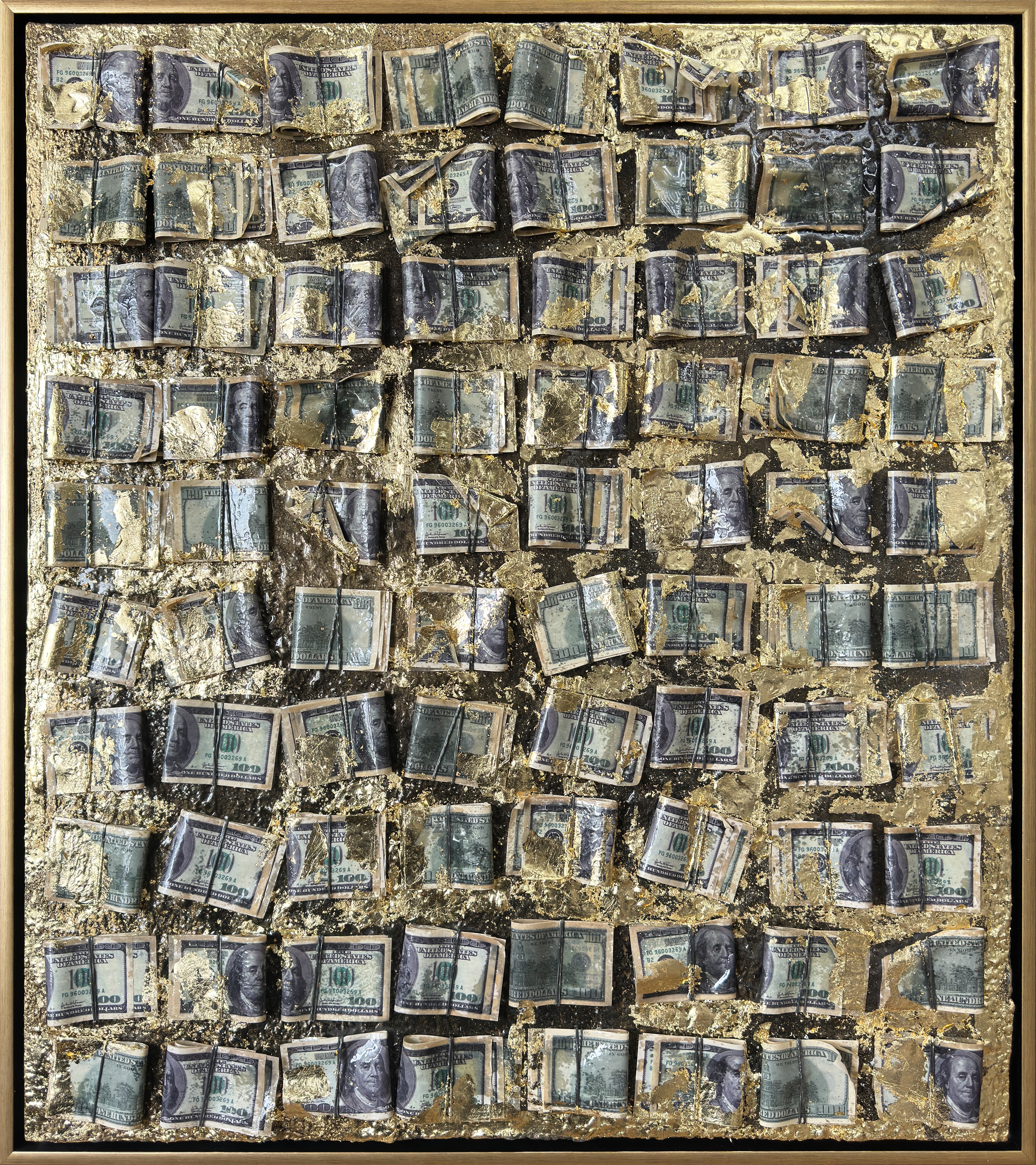 "The Secret Behind the Green and Gold" is an ode to earthly energy, the beauty of natural resources and the eternal attraction of wealth in the material and spiritual sense. The painting is a unique combination of textures and materials: the canvas surface is covered with voluminous cubes resembling precious stones or miniature ingots. Green, gold and silver shades are masterfully intertwined and sparkle, reflecting light differently with each glance.