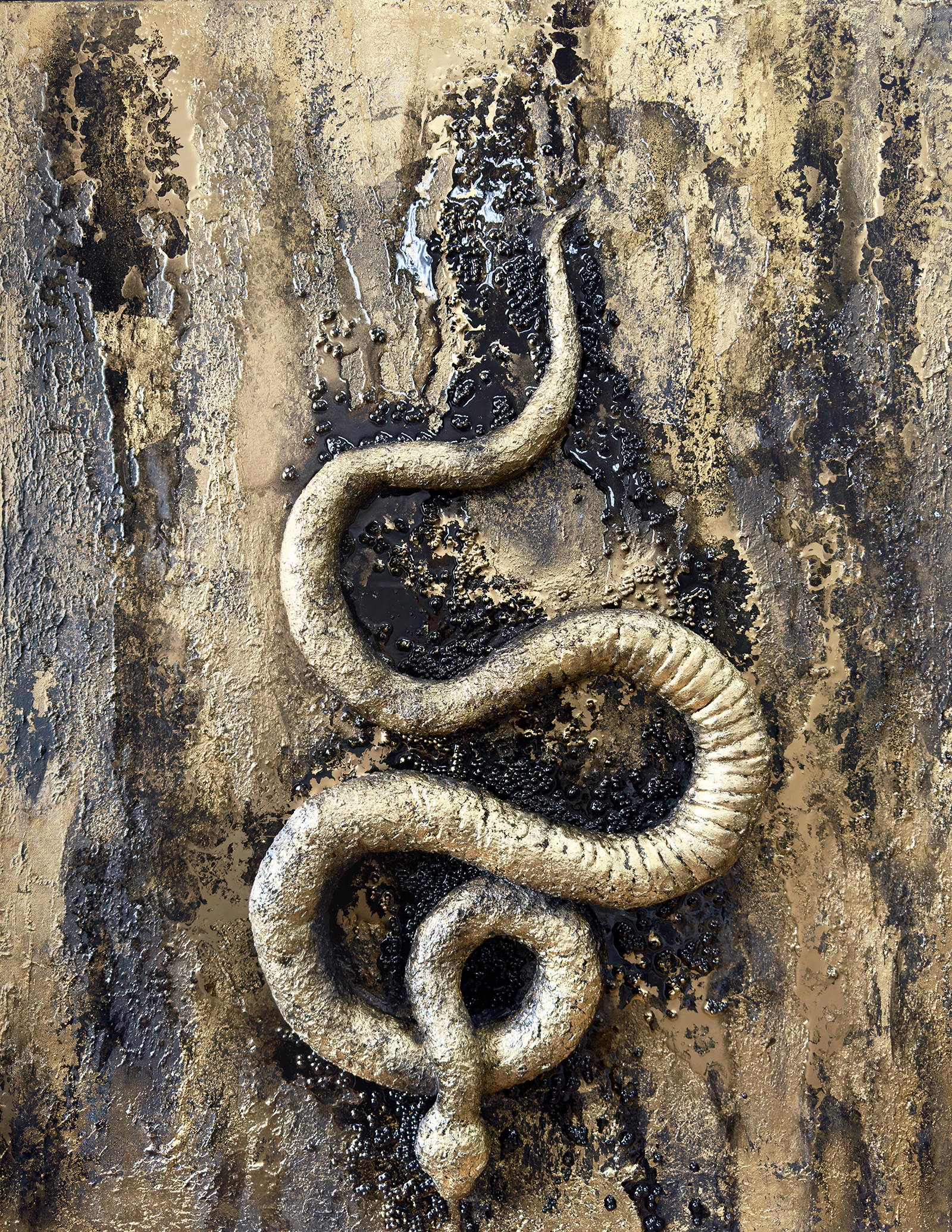 The textured surface amazes with its diversity - you want to look at it in different lighting: the play of light and shadow builds new meanings and images. The snake is often associated with the power of wisdom, medicine, renewal, and in this version it seems to connect the heavenly and the earthly, standing guard over change.
