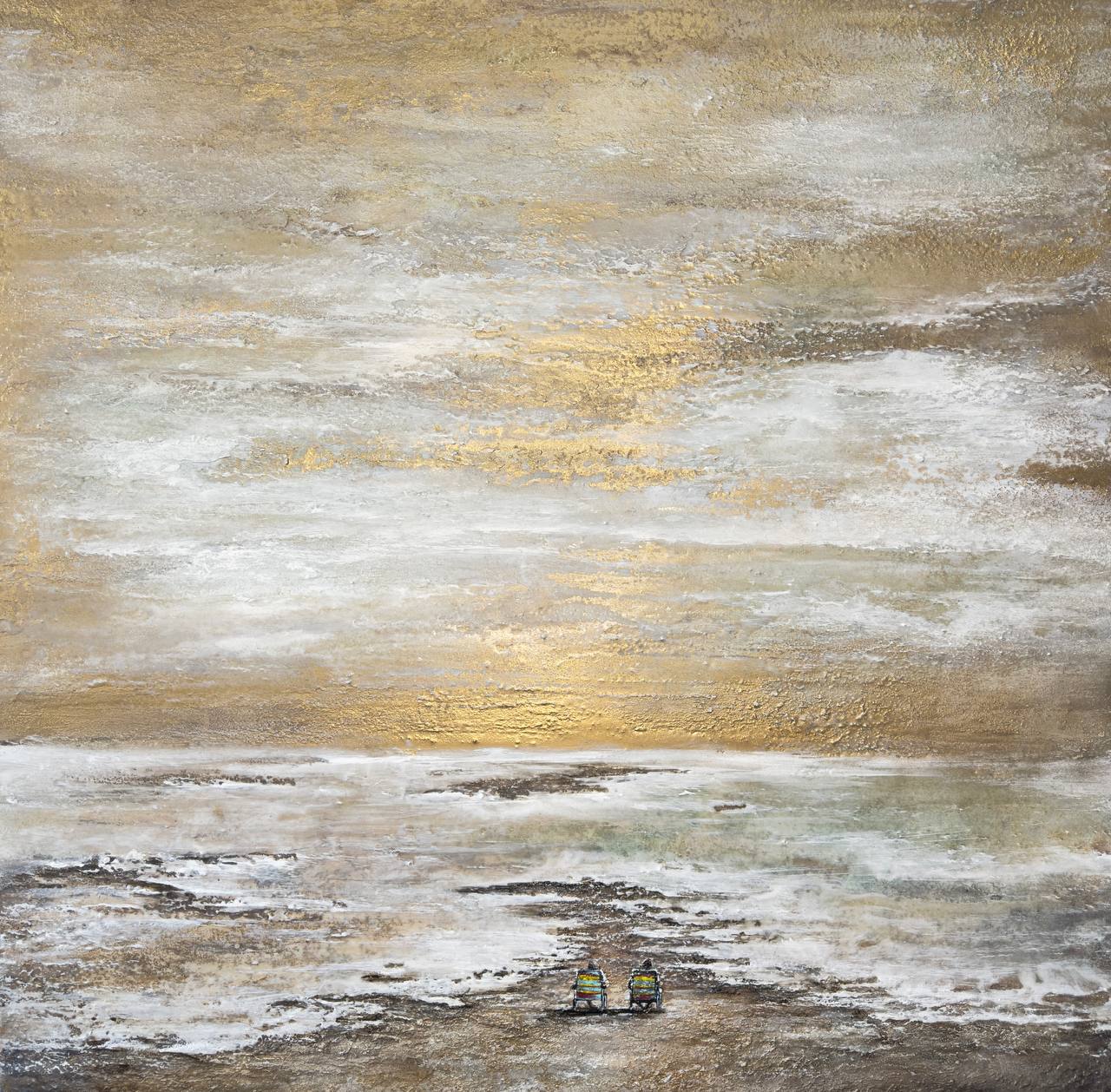 This canvas reveals the theme of harmony between man and nature, time or even between two souls. The composition is minimalist, focusing attention on two small figures sitting on the shore of the endless sea under the golden sunset sky. Around them is a serene eternity: the surface of the water reflects the light, and the clouds are scattered with gold and mother-of-pearl.