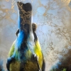 The background of the work is painted with spectacular abstract stains of soft blue and golden colors interspersed with shimmering lines like molten gold. All this resembles a weightless web of morning air, when the sun is just appearing on the horizon and each leaf trembles with pristine freshness. The titmouse's bright plumage flows from yellow to blue, and the dark mask on its head highlights its character and individuality.