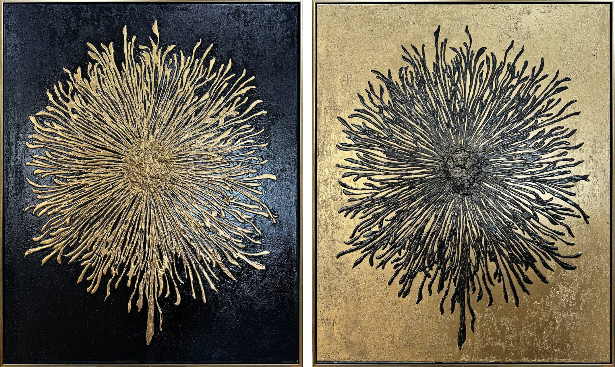 The abstract work "Yin Yang" refers to the ancient symbol of balance and eternal circulation. The painting seems to dissolve the traditional black and white simplicity of the sign, replacing it with a complex play of textures and shades. The large oval space, occupying almost the entire surface, is filled with an incredibly rich texture: golden, sparkling placers seem to "flow" along the relief background, shimmer with translucent layers of gray-blue and white, and in places - thick gold. There are no clear boundaries between "yin" and "yang" - they smoothly flow into each other, as if in the image of a whirlpool or ancient earth rock, in which the power of the elements is hidden. The mixed technique of the canvas creates the illusion of depth, and the complex chiaroscuro pattern allows you to see on the surface either the disturbance of water, the movement of the wind, or the frozen traces of time. All these elements are united into a single indivisible whole, like the meaning of Tao itself. The painting contains a philosophy of balance: in every chaos there is harmony, in every harmony there is a particle of movement. "Yin Yang" is not only an abstraction, but also an invitation to a personal search for integrity. The viewer is presented with a multidimensional space in which they can see a reflection of their own aspirations, fears, joys and peace. The work is distinguished by meditative calm, but at the same time it is filled with energy, as if nature itself is conveying its ancient laws of balance to the viewer.