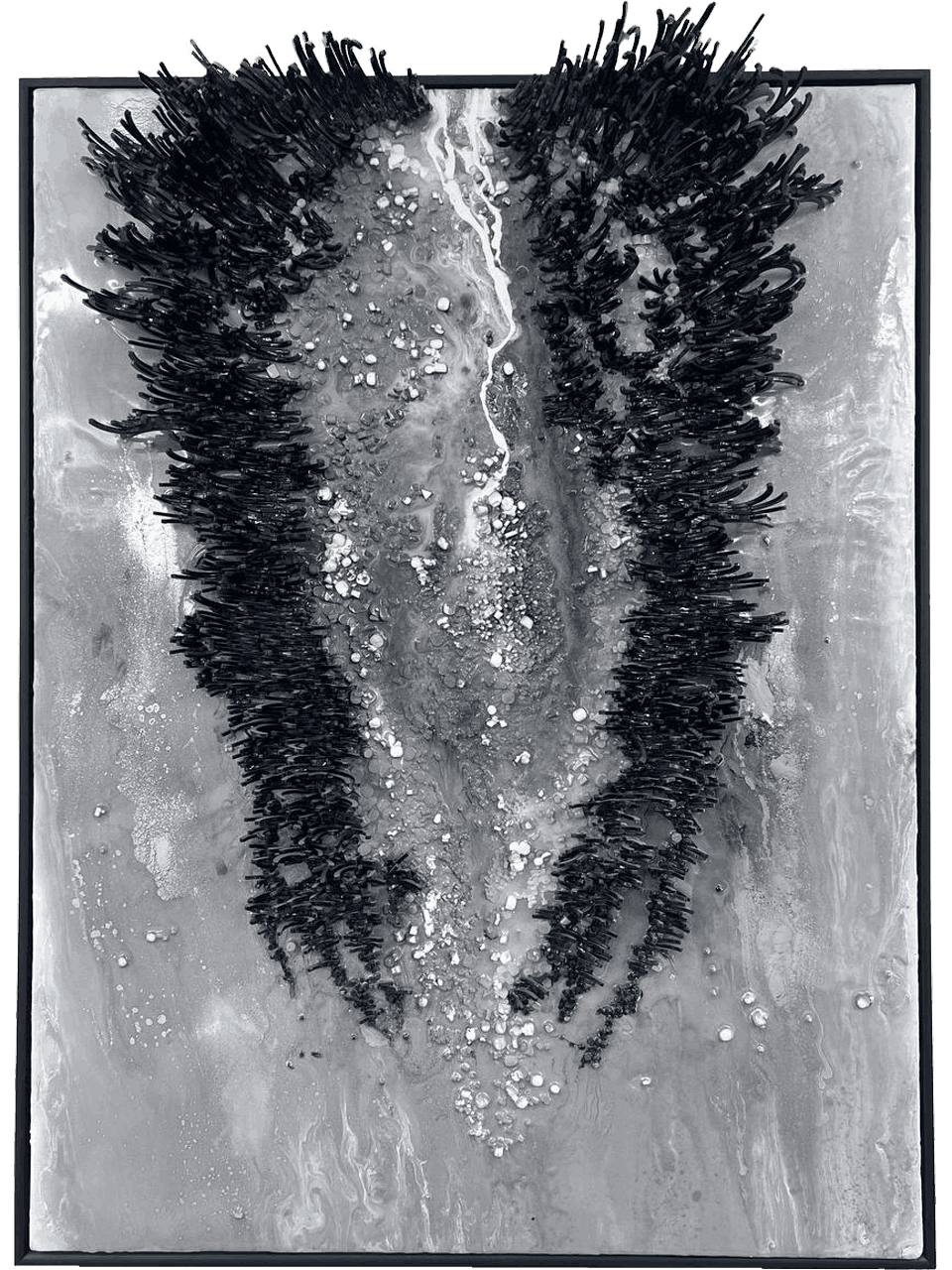 The painting "MetaGenesis" is a visual reflection on the very moment of the birth of something new. The artist creates the effect of a cosmic event: streams swirl on the canvas, permeated with a scattering of tiny particles. The central composition resembles both a mysterious portal and a deep cut in the rock, in which a new universe is carefully preserved. The abstract image seems to obey a strict internal logic: a vertical "axial" line, descending from top to bottom, like a stream of energy or life-giving light, divides the composition into two asymmetrical parts. Thick black relief fragments are grouped on the left and right - they symbolize chaos, from which order is born. Numerous white and silver inclusions give the work volume, reminiscent of myriads of stars scattered across an unknown galaxy. Additional volume is given by complex textures achieved by mixed media using texture pastes, possibly acrylic and mineral additives. Silver-gray, graphite and white tones make the work strictly monochrome, and this, in turn, emphasizes the universality of the idea of origin itself, without tying it to a specific world or era. "MetaGenesis" is not only about the beginning, but also about endless movement, about the transition from one form to another. It is an explosion of energy and at the same time a meditation on eternity, forcing one to think about the mysteries of the origin of matter and spirit.