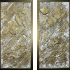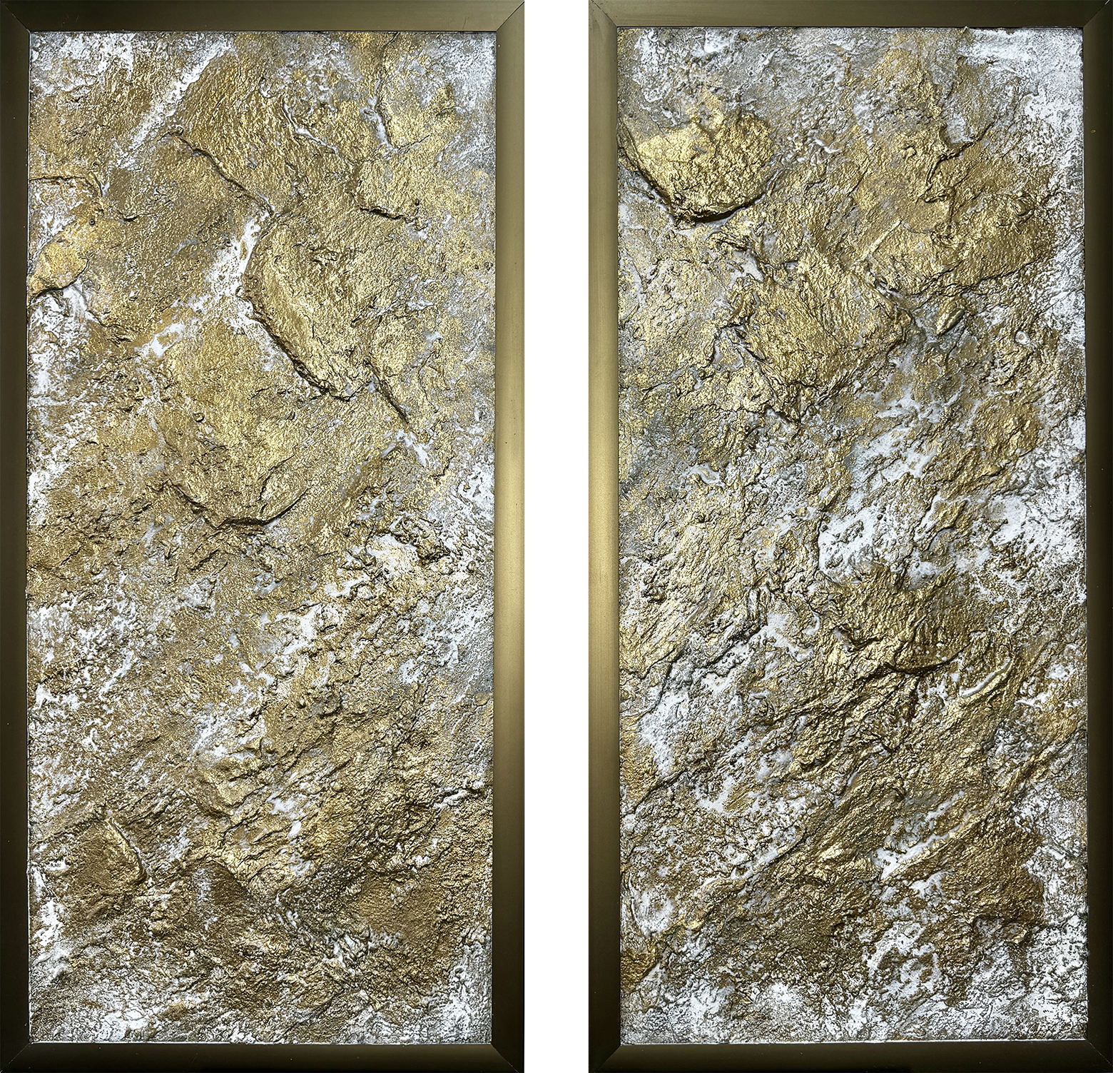 At the center of attention of each part of the diptych is an abstract image, resembling more a geological formation than a picturesque landscape. Its bizarre forms, covered with cracks, depressions, and protrusions, seem to be a symbol of the wealth of the earth’s interior, the energy of life, and the indomitable power of nature. The artist uses various shades of gold, silver, and white to convey the play of light and shadow on the surface of this abstract landscape, as well as to emphasize its texture and volume. The image seems to pulsate with energy, attracting the eye and evoking a feeling of awe before the majesty of the universe.