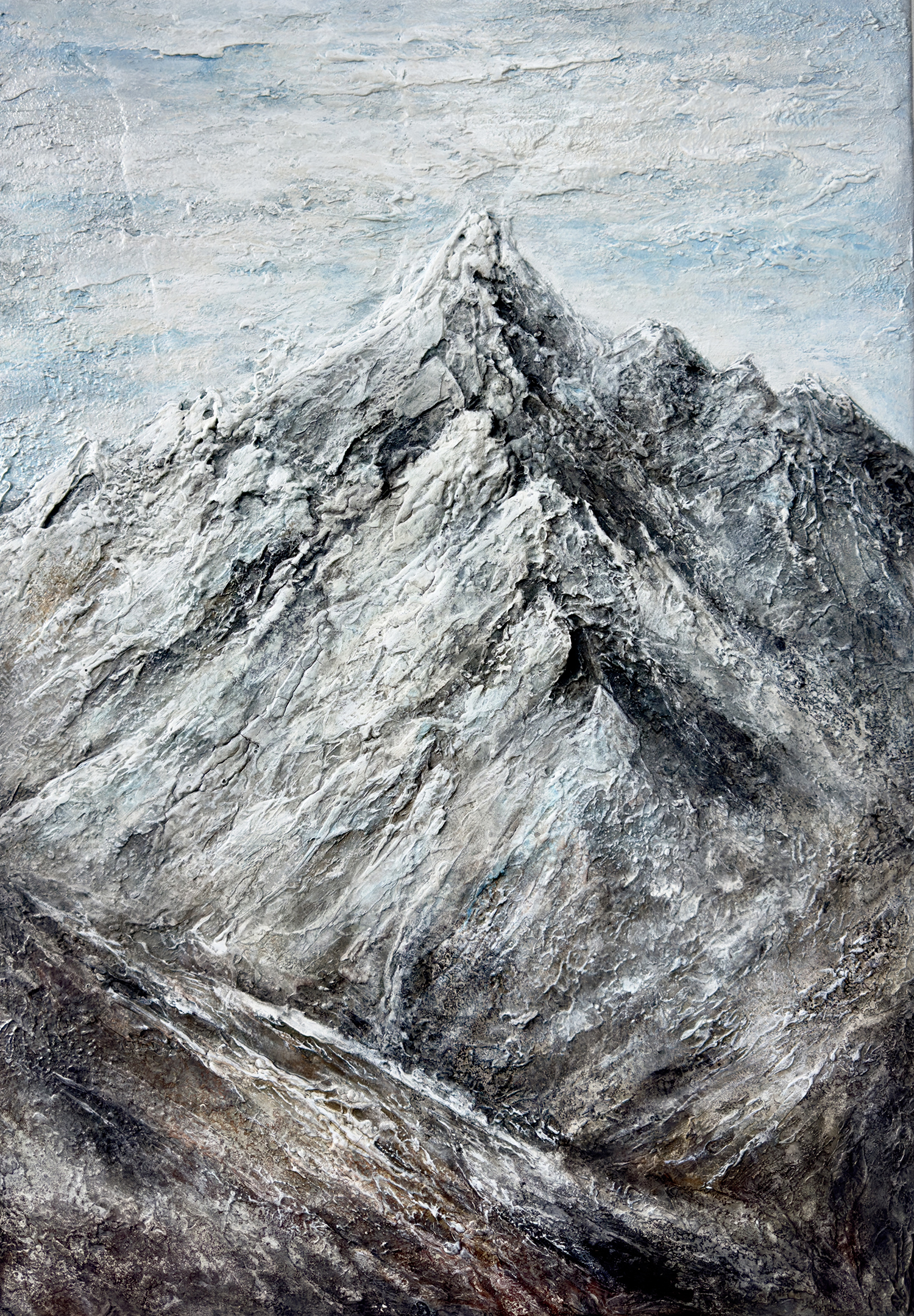 At the center of attention of the painting is a majestic mountain, stretching upwards. Its massive slopes, covered with snow and ice, seem to be a symbol of strength, power, and steadfastness. The artist uses various shades of gray, white, and brown to convey the play of light and shadow on the surface of the mountain, as well as to emphasize its texture and volume. The mountain seems to be a living being, possessing its own energy, its own character, and its own soul.