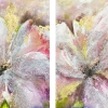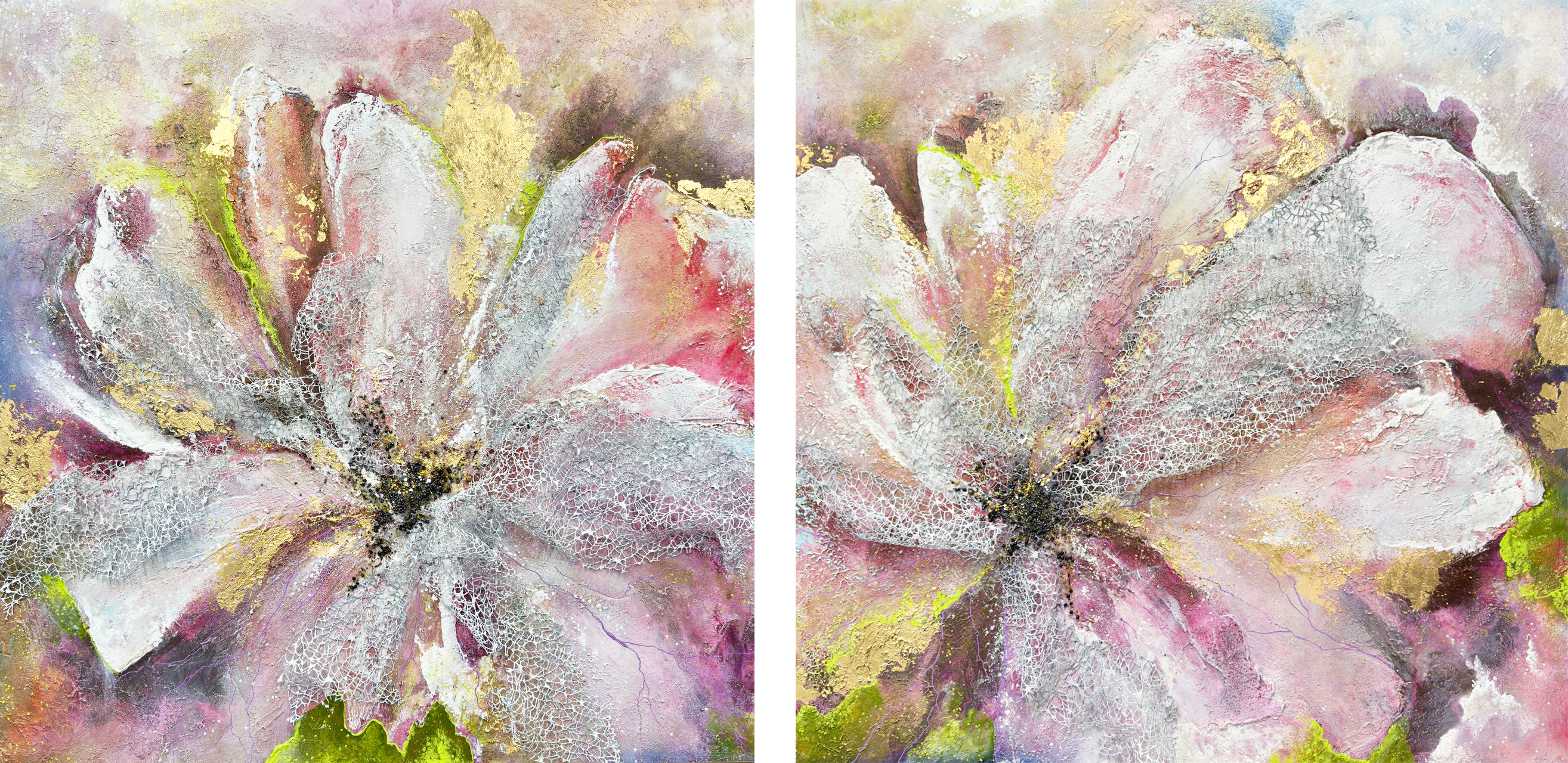 На каждой из двух частей диптиха изображен цветок. Художница активно использует технику, создающую эффект кракелюра (трещин) и мраморного узора, что придает поверхности богатую многослойную фактуру.