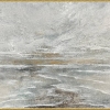 The canvas is framed with a thin gold frame that contrasts with the dominant palette: shades of white, gray, silver, and muted gold. The surface of the painting has a pronounced texture. Thick relief brushstrokes create the impression of a frozen landscape, dense fog, or perhaps a still sea surf.