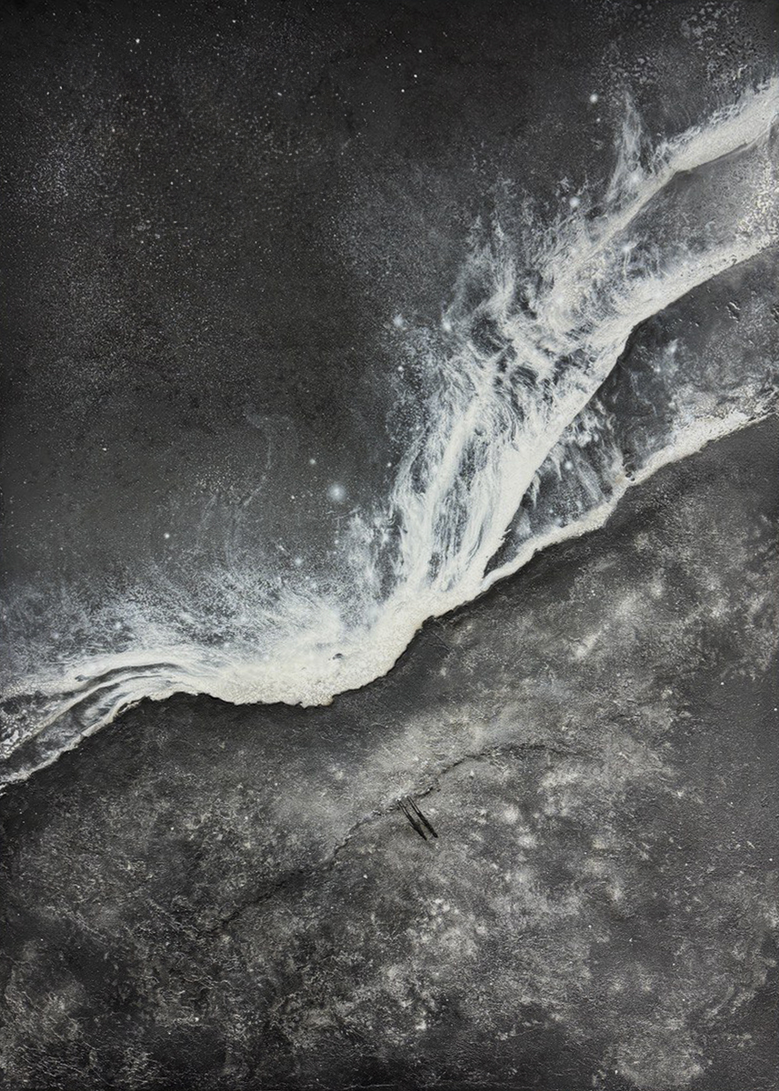 Картина Ксении Елисеевой “Дыхание Космоса и Мы” — это глубокое, абстрактное размышление о месте человека во Вселенной, выполненное в драматичной черно-белой гамме.