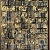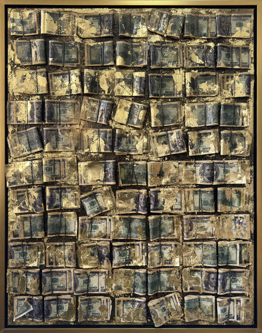 The canvas is filled with rows of banknotes, U.S. hundred-dollar bills, arranged and slightly distorted to create a textured grid. These bills are not simply painted; they appear partially covered or dissolved in something golden, possibly gold leaf or thick golden paint.
