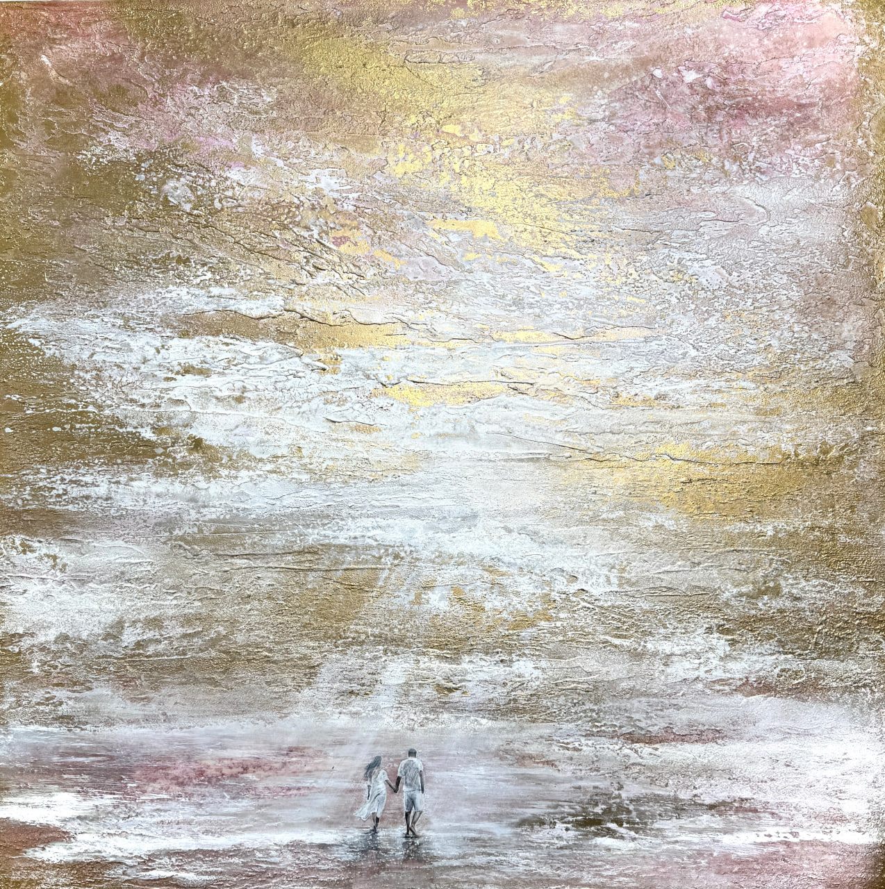 Despite their small size, the figures are the emotional center of the painting. They symbolize community, the beginning of a shared journey leading to the promised abundance represented by the glowing golden landscape above.