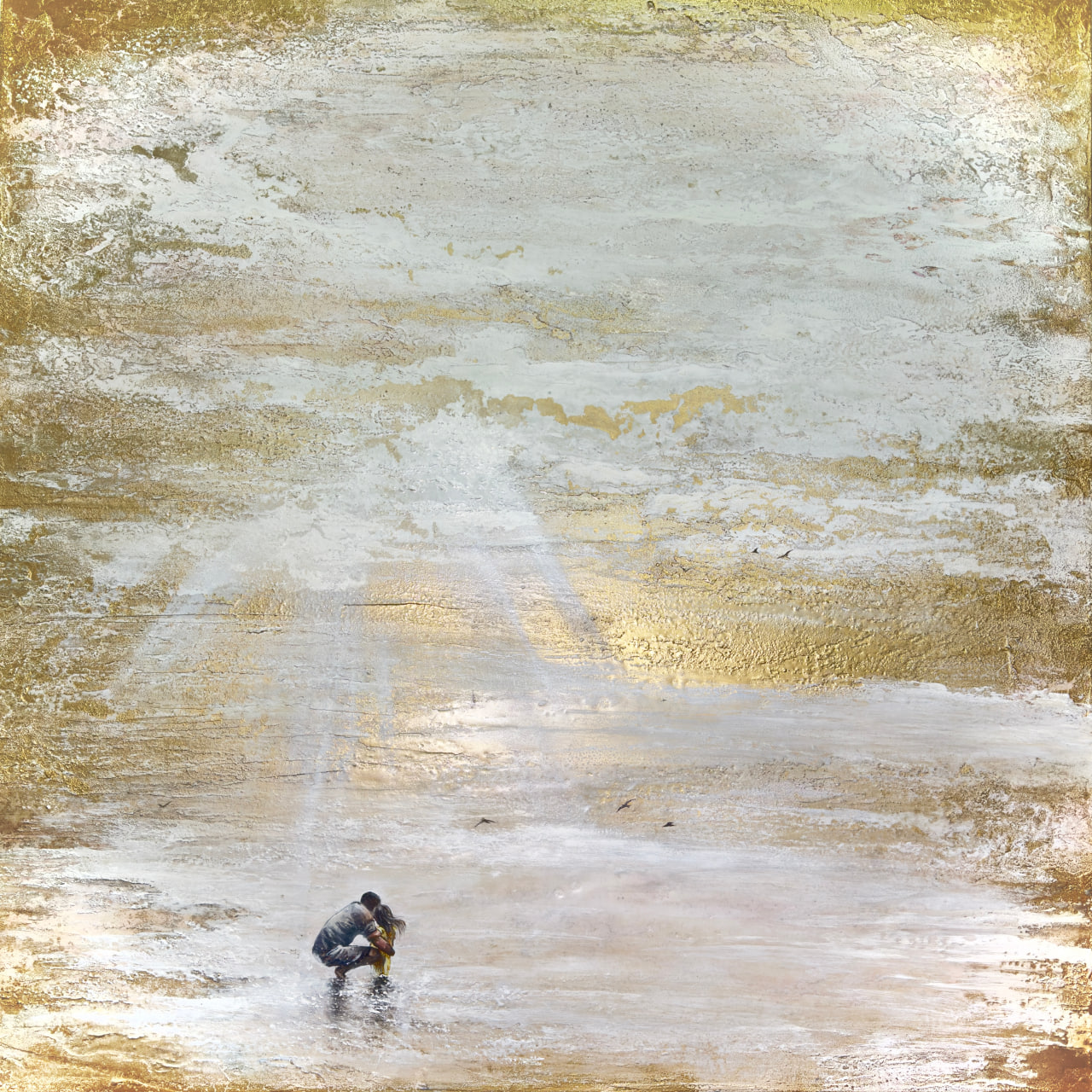 The central element of the composition is two tiny dark figures at the bottom of the painting. A man is crouched down, gently embracing a child. Their figures, barely distinguishable against the dazzling radiance, symbolize a deep bond that protects them.