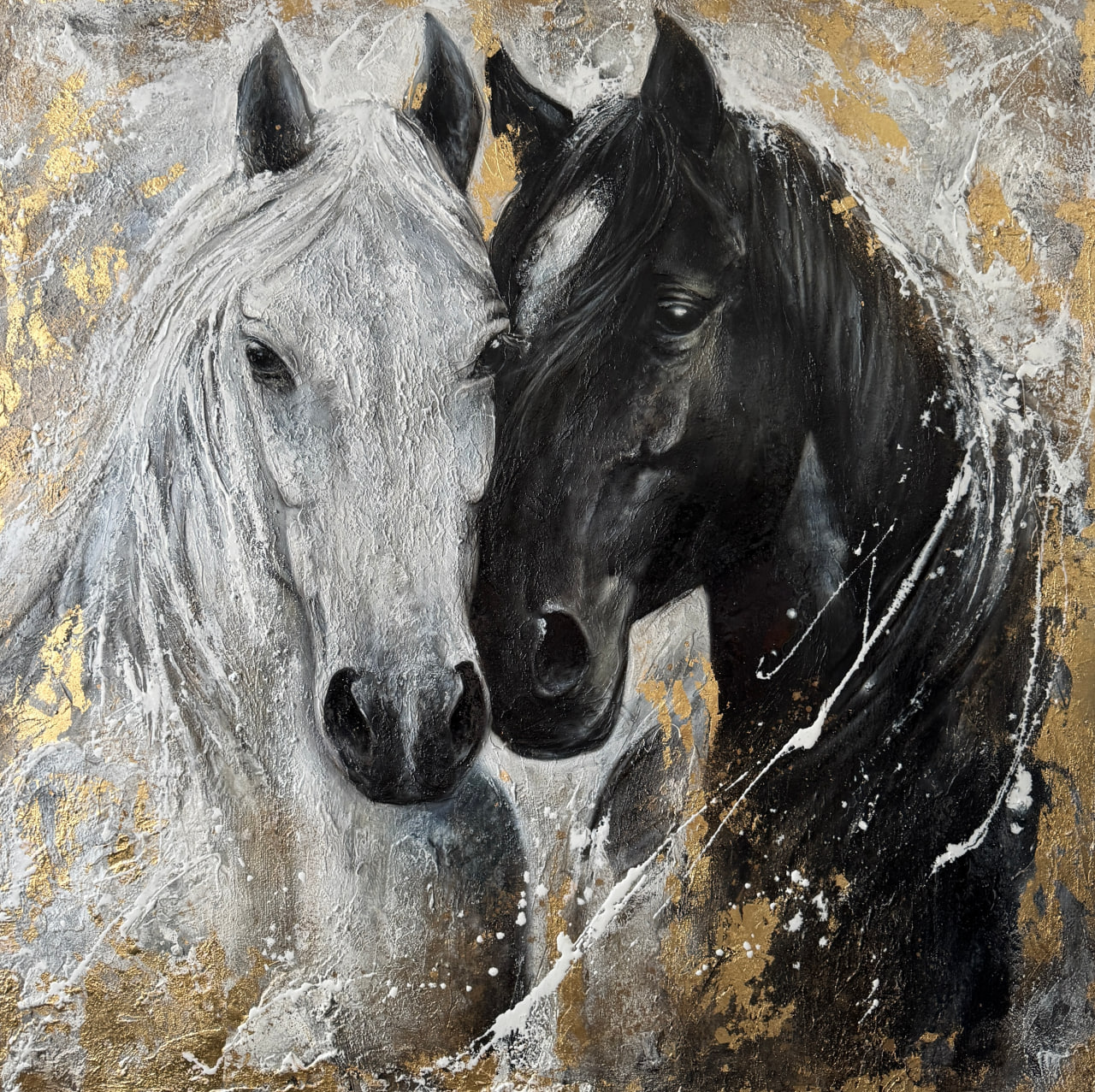 The artist employs a bold, expressive technique. Textured brushstrokes and paint splatters create a sense of movement and energy, as if the horses are bursting out of the background. Golden flecks on the background and along the edges of the figures add luxury and mystical glow to the piece, emphasizing the idea of «luck».