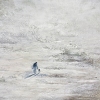 At the center of the expansive textured space are two small figures: a woman and a child walking together, holding hands. Their dark silhouettes sharply contrast with the dazzlingly bright, almost monochromatic background, reminiscent of a snowy landscape, a foggy field, or clouds.