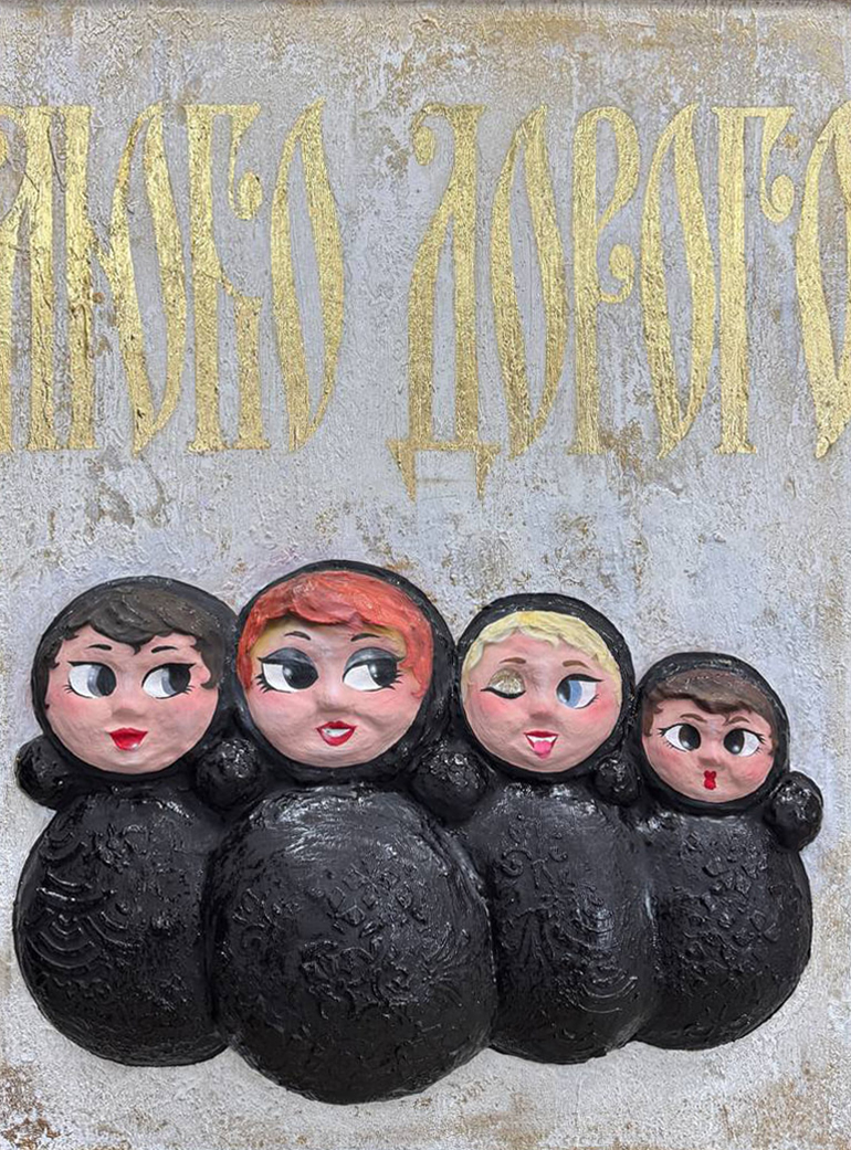Ksenia Eliseeva’s painting «The Semantic Tumbler Toy» is an ironic and profound art object, where cultural codes of Soviet childhood blend with sacred aesthetics. The artist uses the recognizable image of tumblers, placing them against a background textured like ancient frescoes, where gilded patterns create a solemn, almost temple-like context.