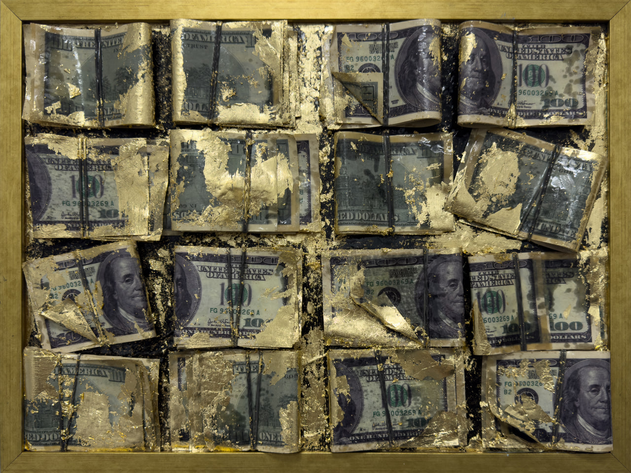 This technique instantly elevates ordinary objects — money — to the status of sacred artifacts, hinting at the golden standard of happiness in modern society. The worn appearance of the bills and their careless fastening with rubber bands, contrasting with the luxury of the gold covering, create a dual meaning: money brings joy, but this joy is ephemeral, stained, or already fading.