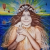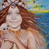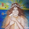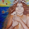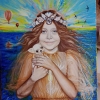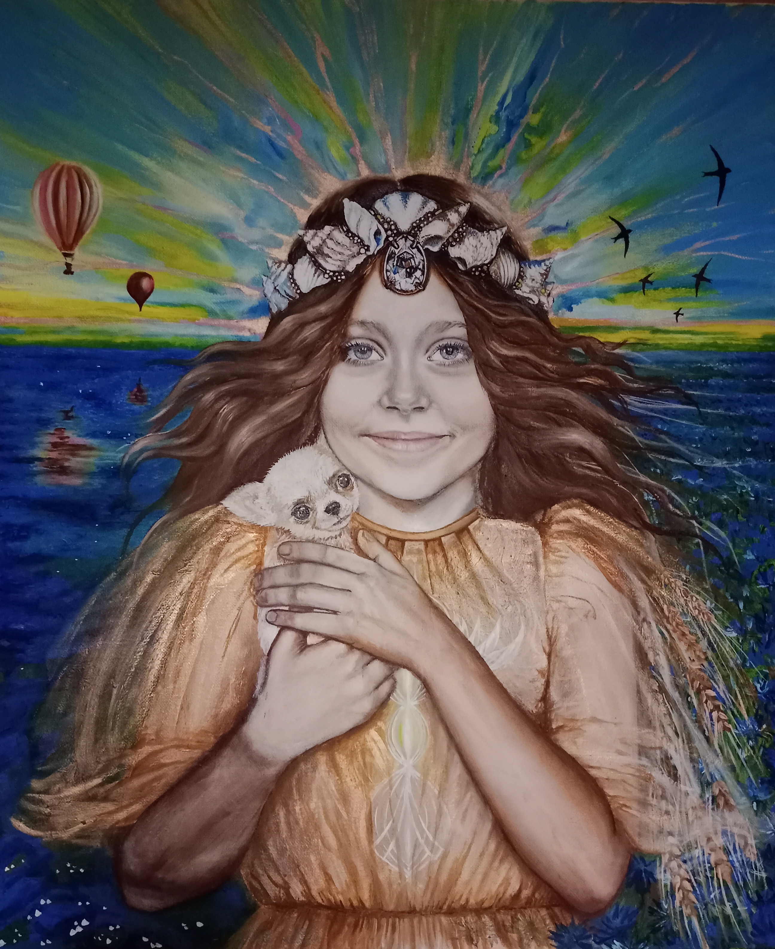 Children's multidimensional portrait. Created using a unique multilayer technique. The radiance of a child's heart. The eyes emit warmth, harmony, and the calm music of the soul. A sea of cornflowers on one side smoothly transforms into ocean waves on the other. Swallows symbolize speed, dynamics, and freedom. The girl as an integral part of the Whole World.