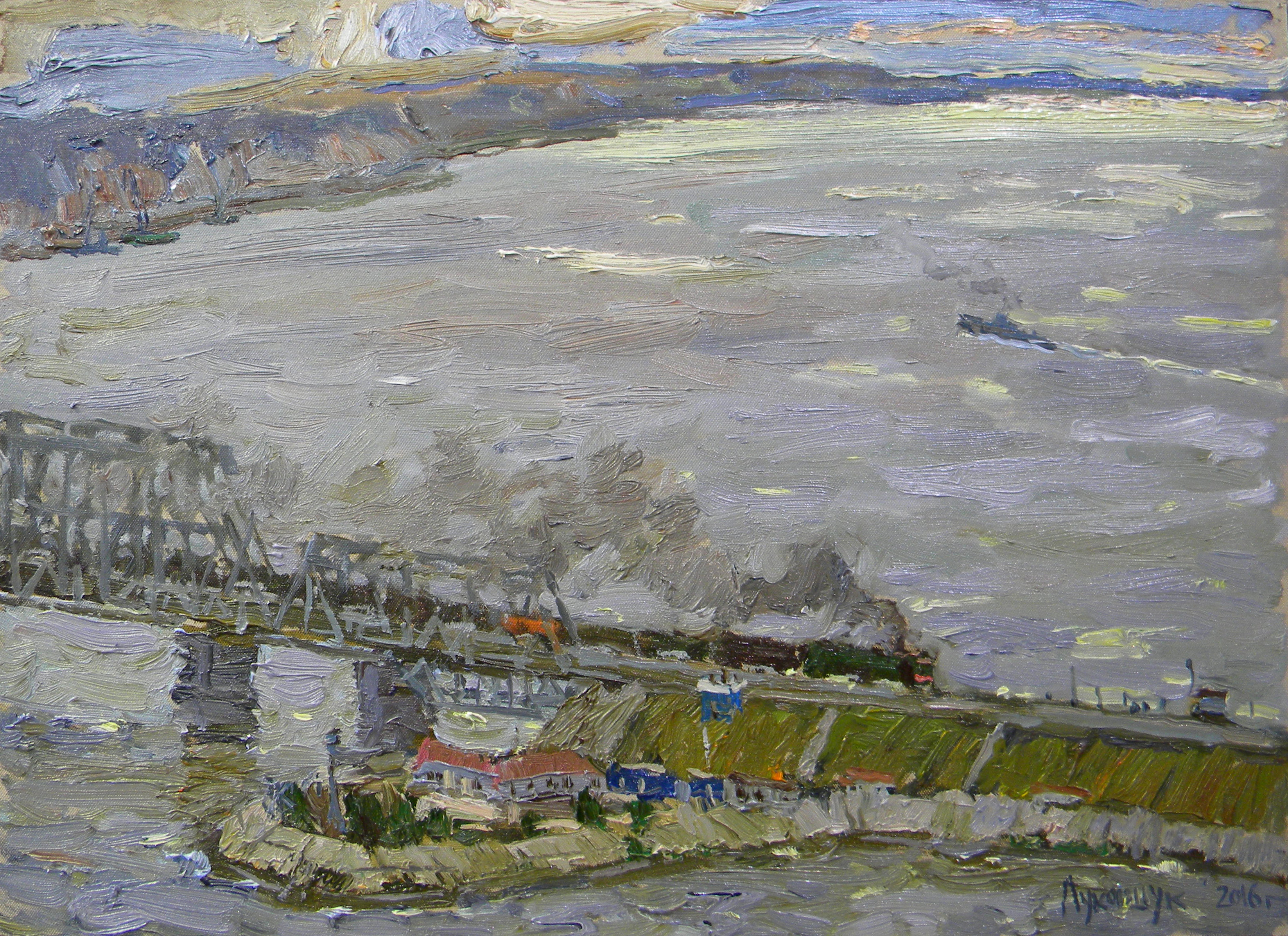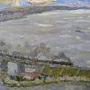 "Emperor's bridge." is a monumental and romantic ode to the river and man. From above, a powerful structure is shown crossing the overflowing Volga. On the left, by the pier, there are buildings with red roofs; on the right, there is a railway bridge stretching into the distance, disappearing into the bluish haze of the horizon. The entire space is covered with broad, shimmering brushstrokes: the water surface shimmers with steel, blue and yellow shades, emphasizing the solemnity and simultaneous severity of the river. In the distance, you can discern the silhouettes of boats, a train crawls along the bridge, smoke flows around - a symbol of movement, long routes, historical intersections of destinies. The work is painted dynamically, energetically, with a sense of admiration for the engineering power and rhythm of the eternal Volga. The artist combines nature, man and technology in one composition, demonstrating how harmoniously they can all coexist, be part of the history and modernity of their native land.